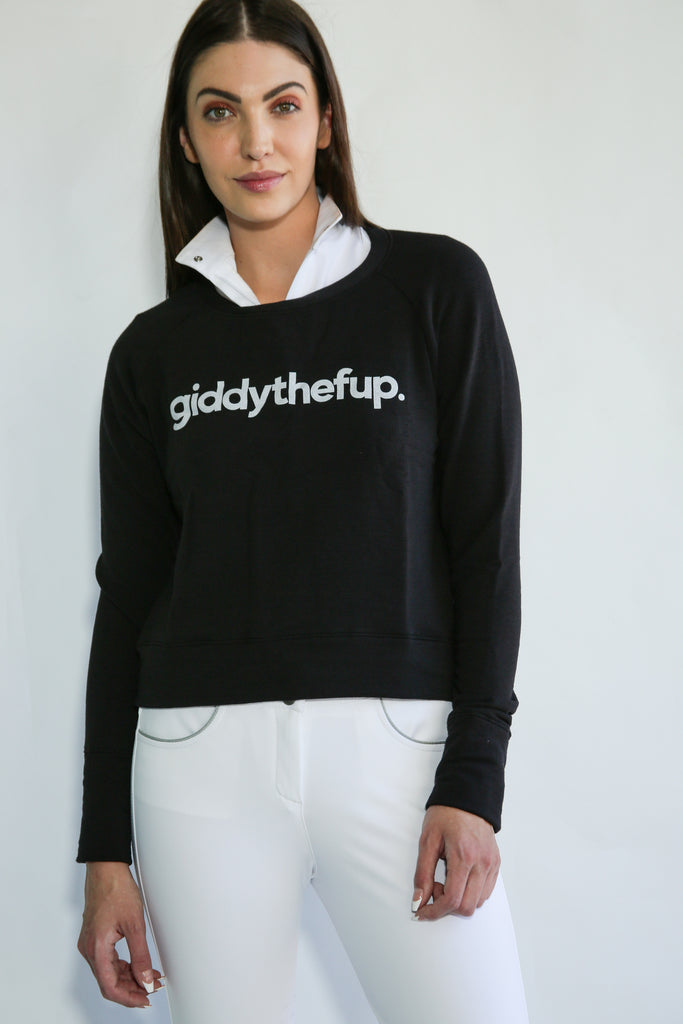 The "giddythefup.” long sleeve fleece lined relaxed scoop neck sweatshirt is our best selling casual luxury top! It will quickly become your favorite barn or after competition light weight sweatshirt. You can also just pair it with skinny jeans and boots for the perfect chic casual eqgirl look. This shirt was inspired by all the eqgirls that love to sass! It pokes fun at the sometimes too conservative way we view our sport, and reminds us that all eqgirls deserve a little giddy up in their lives.