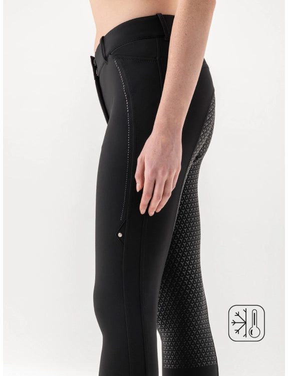 Crafted with B-MOVE all-season technology, these women’s high waist full grip breeches offer year-round comfort. Thanks to their design, they ensure maximum comfort while enhancing the female figure. Boasting a "Y" knee grip system and embellished with tone-on-tone rhinestones on the legs and Equiline rhinestones logo on the back. Complete with a stretch fastening system on the bottom leg and UPF 50+ sun protection.