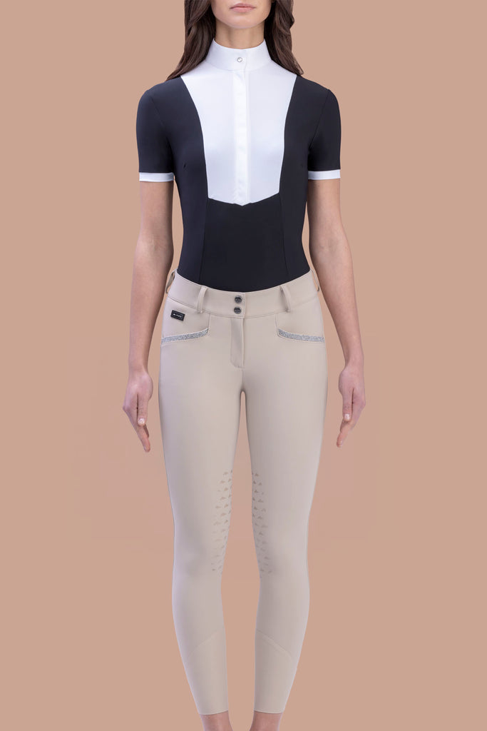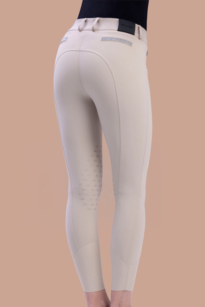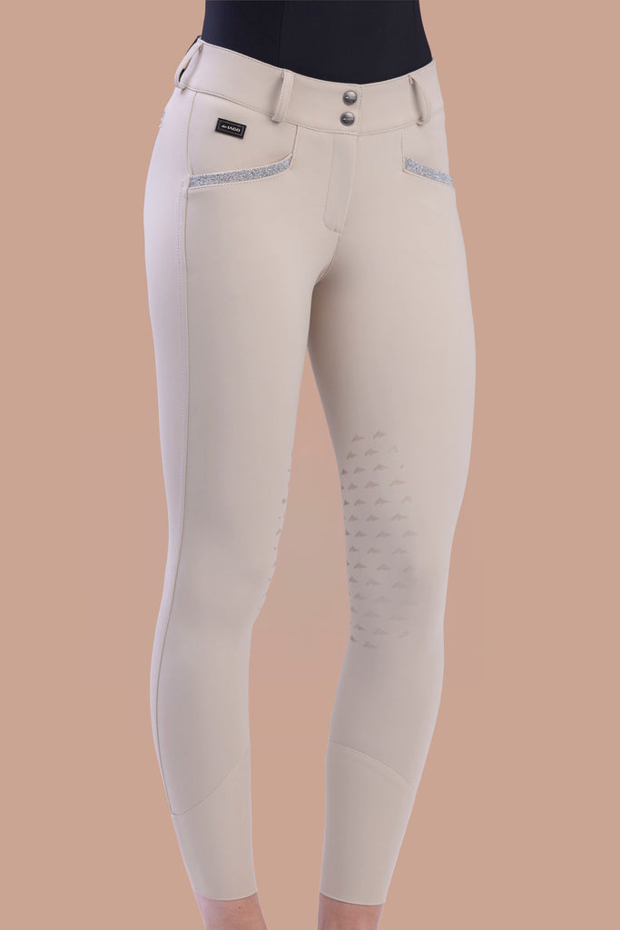 For all of those who love a high rise breech that makes every shape look fabulous! Made with the Superstretch fabric, knitted bonded, composition 72%PA 28%EA, this breech will contour over your shape and give you maximum flexibility in the saddle. The thicker waistband is mid-high rise in the front, and high rise in back, holding you in, in all the right places! The latex knee grip has a subtle design allowing for that extra stick.