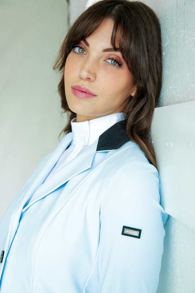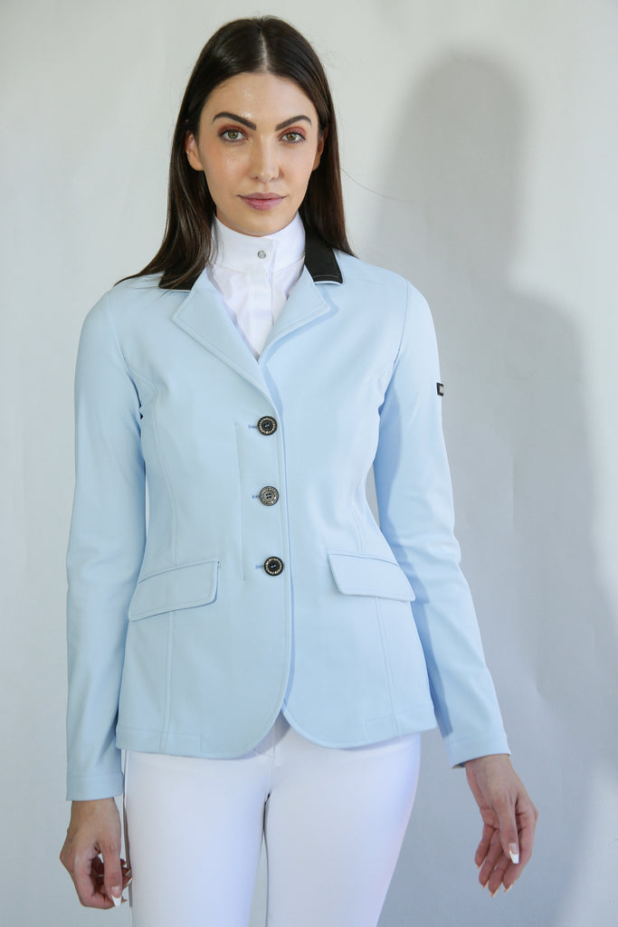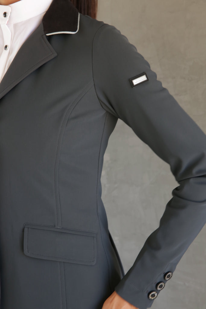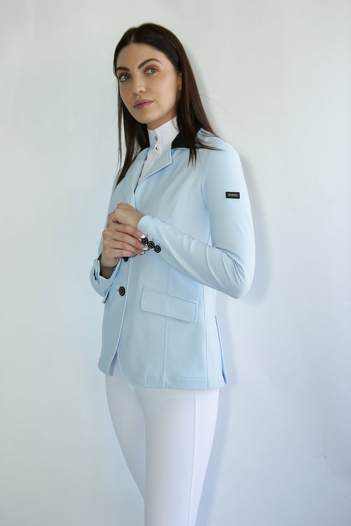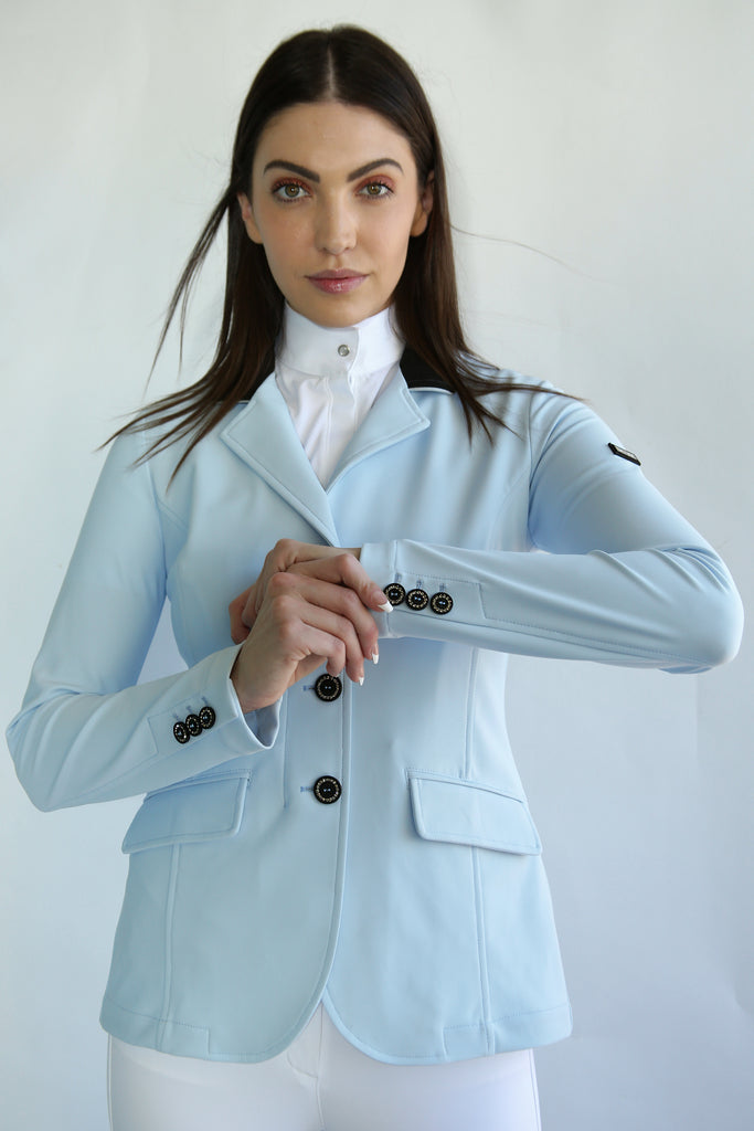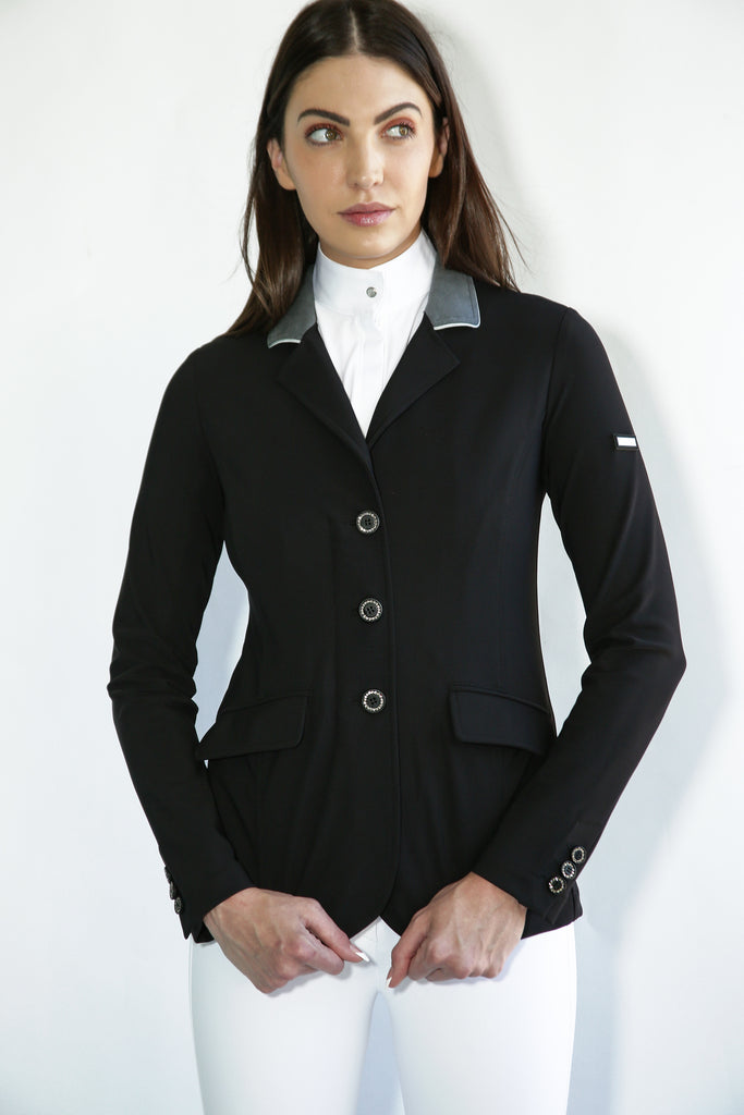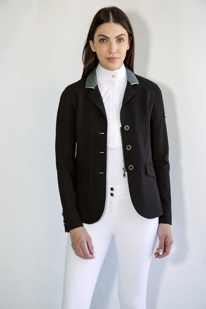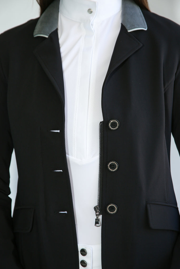 The Sandra show coat is a 3 button classic style show coat with inside hidden zipper. Same style and super light stretch fabric as the Iago Dhalia which has been a best seller for many years. Coat is a shorter style.