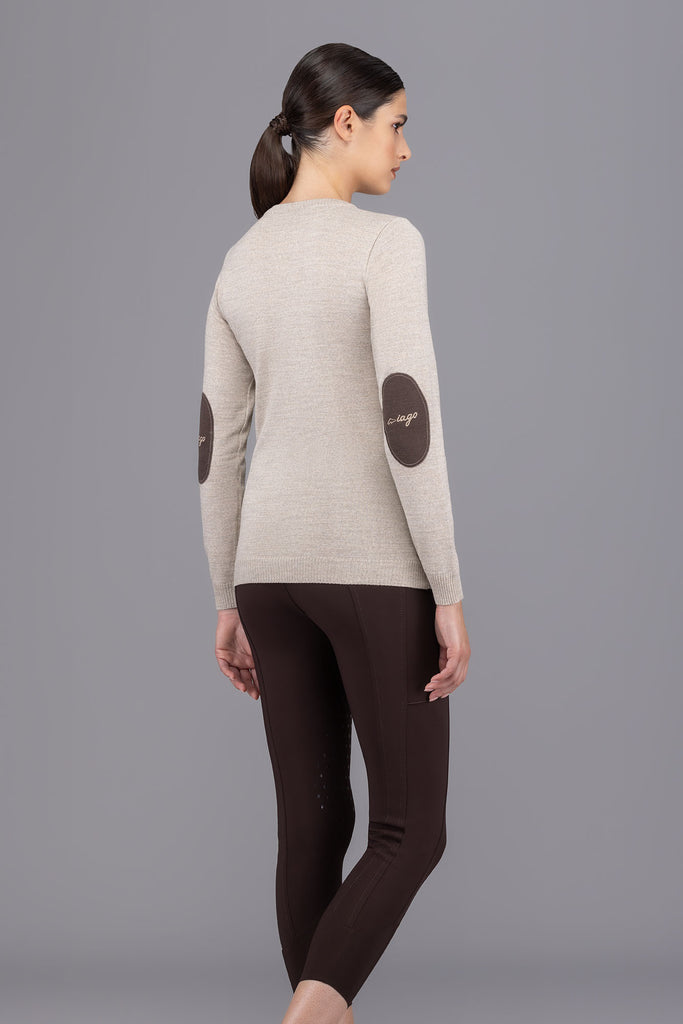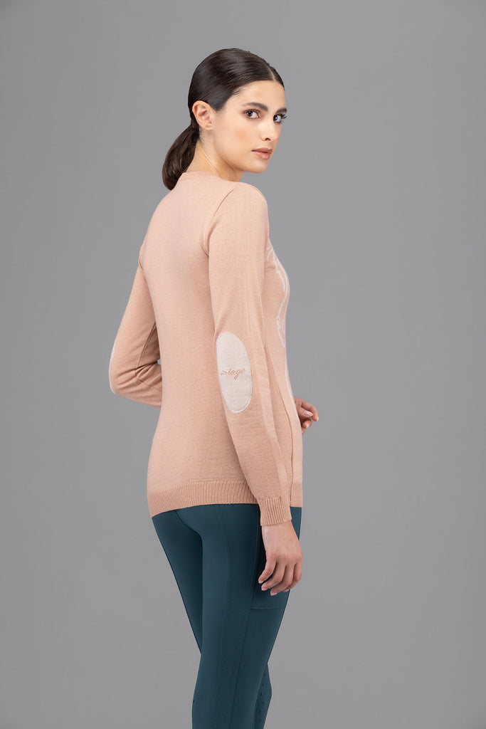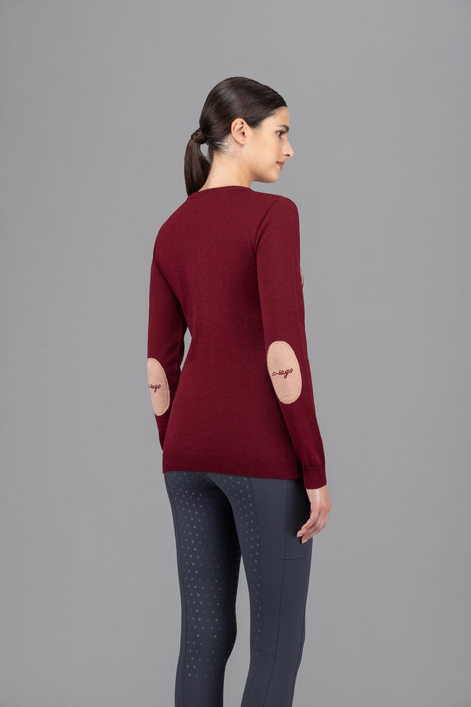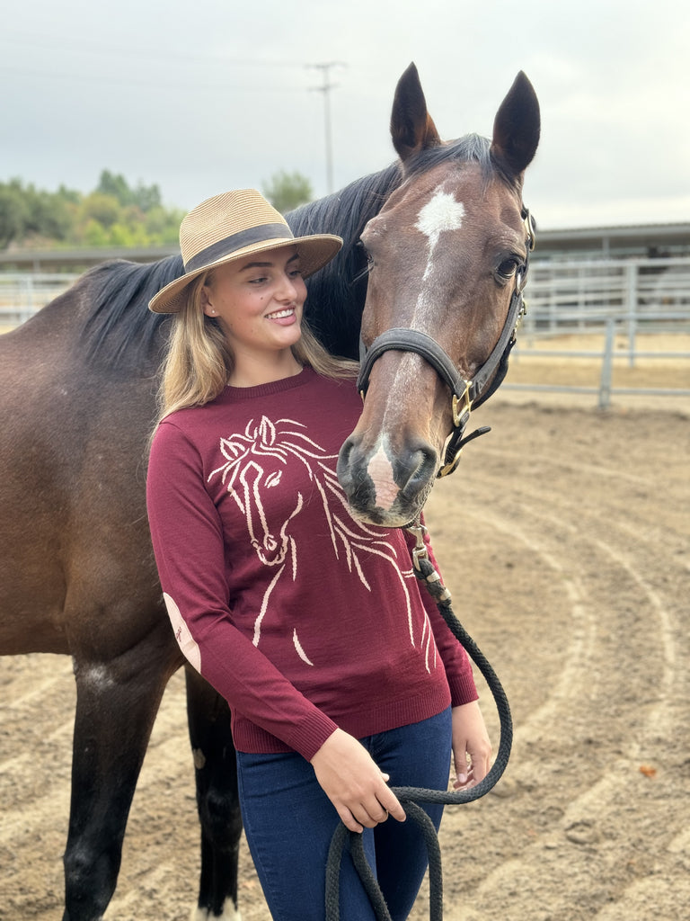 This stunning one of kind pullover crew neck sweater is made from a Merino Wool Blend and is the perfect throw on barn or after show sweater The contrast patches and original artwork add a little fashion to finish off this classic look.