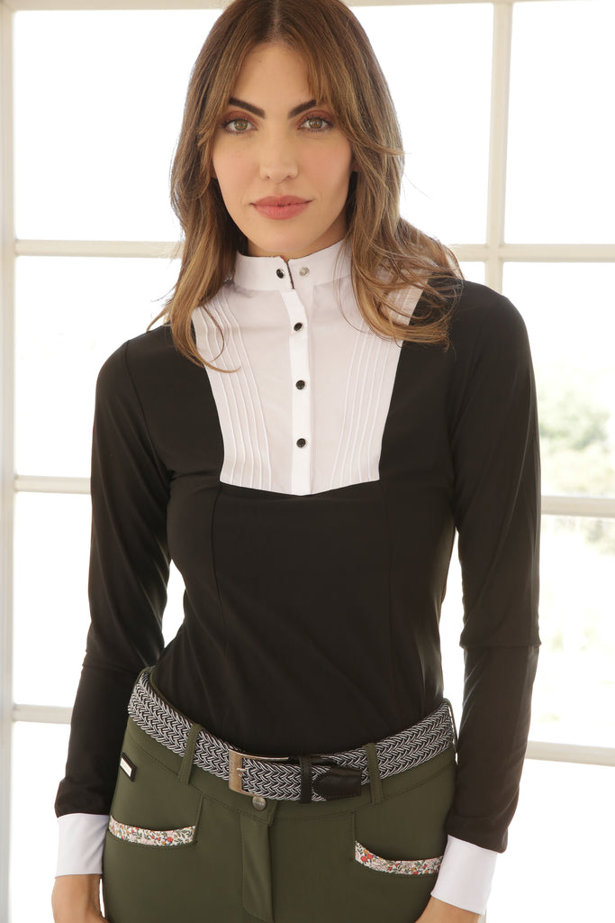 Women competition polo in microfiber fabric 4 way stretch with tuxedo bib details, elegant style. Suitable for competition or leisure riding.