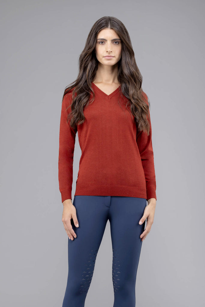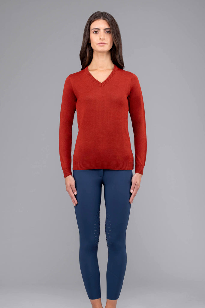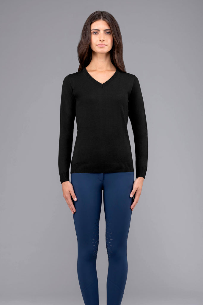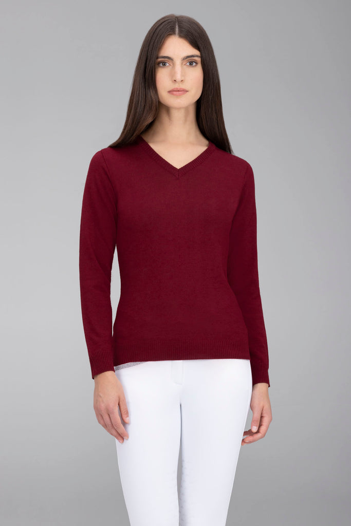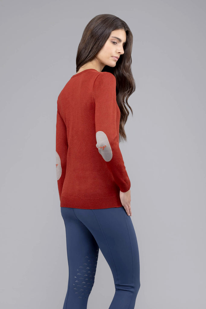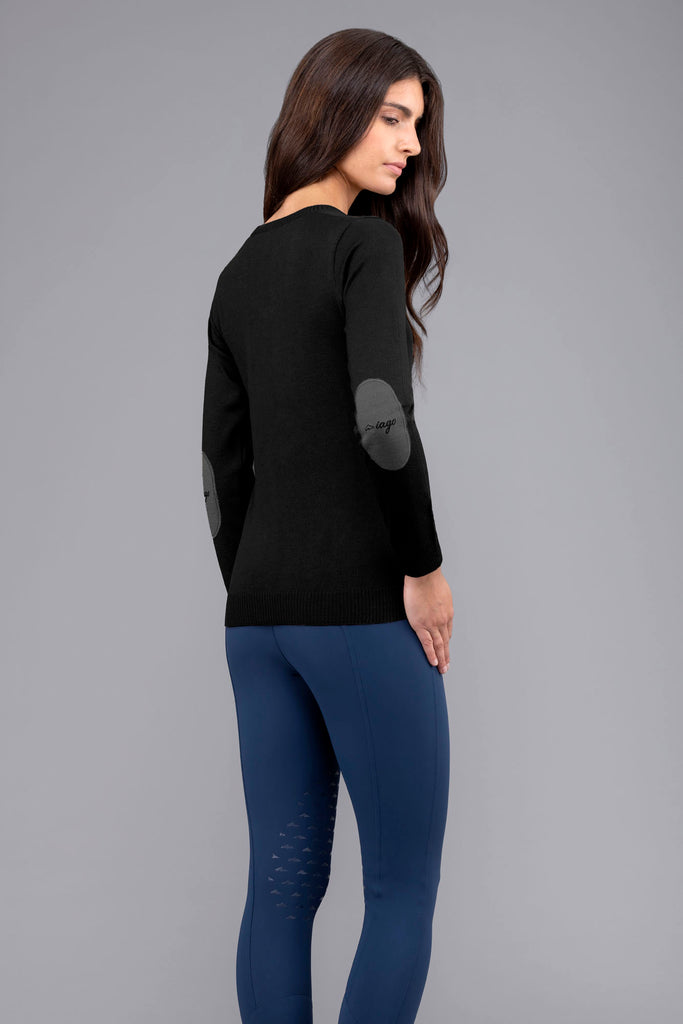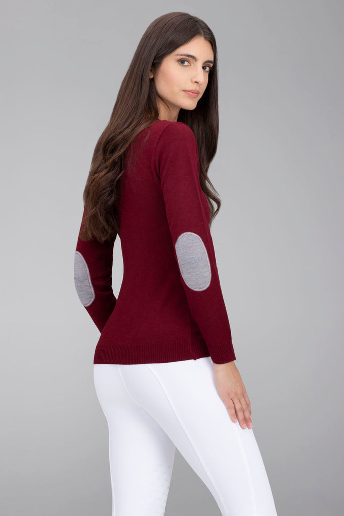 The Julie V-Neck Merino Wool Blend Sweater is the perfect throw on barn or after show sweater. It's light enough to not look bulky, but will still keep you warm on those chilly days. The contrast patches add a little fashion to finish off this classic look.