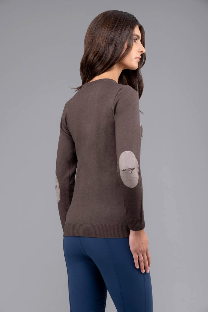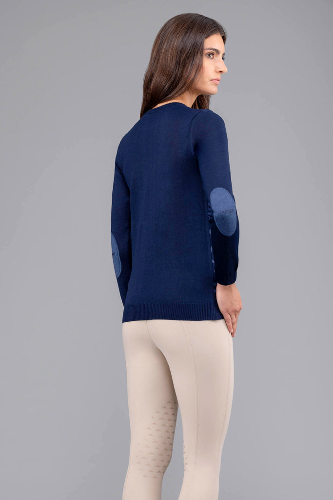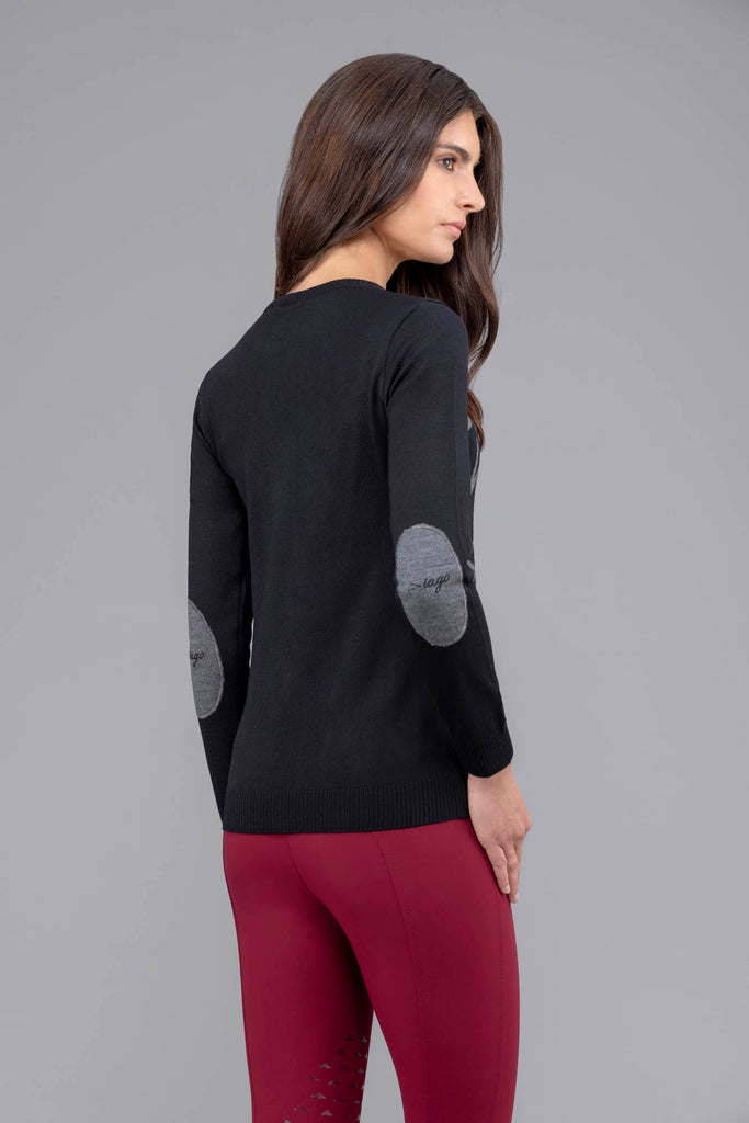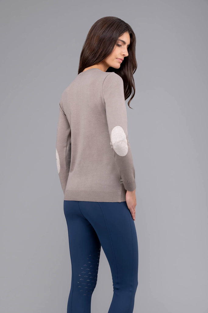 This stunning little pullover crew neck sweater is made from a Merino Wool Blend and It is the perfect throw on barn or after show sweater. It's light enough to not look bulky, but will still keep you warm on those chilly days. The contrast patches add a little fashion to finish off this classic look.