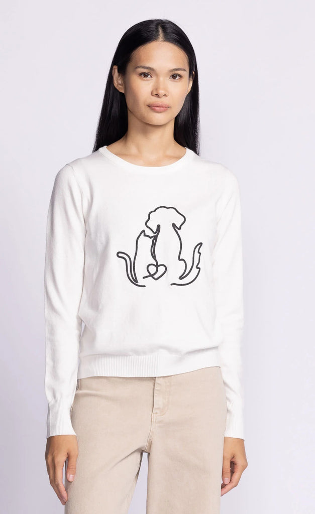 This will be a seasonal best seller based! The Friends Forever Sweater features adorable puppy and kitten embroidery on the front, with cute paw print on the back, all in soft knit fabric. Pair it with jeans or leggings for a cozy, playful look!