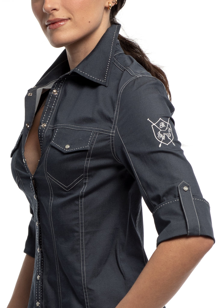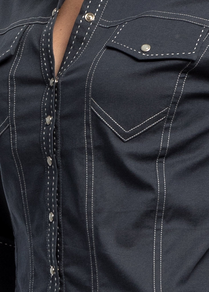 - Mother of pearl snaps and contrast stitching throughout