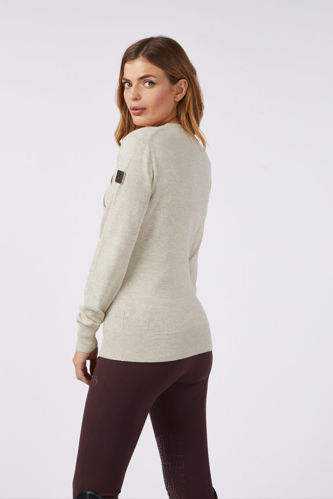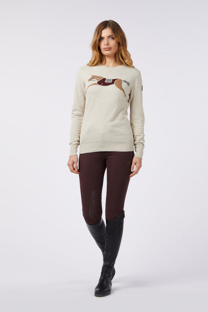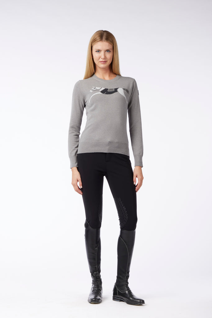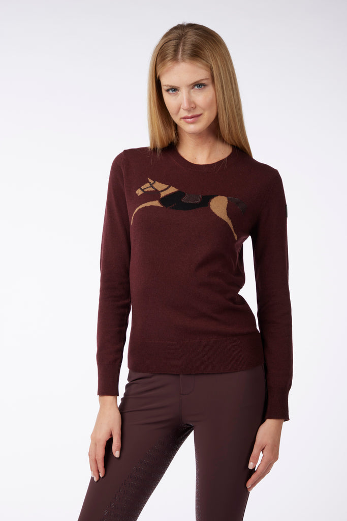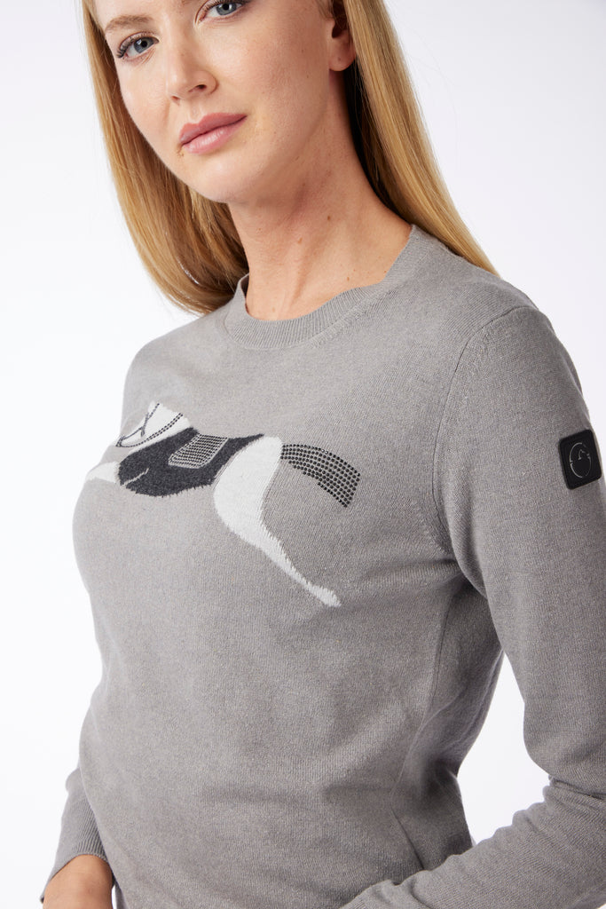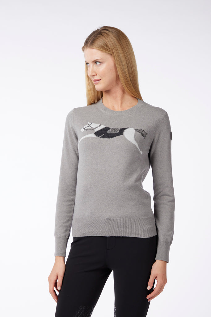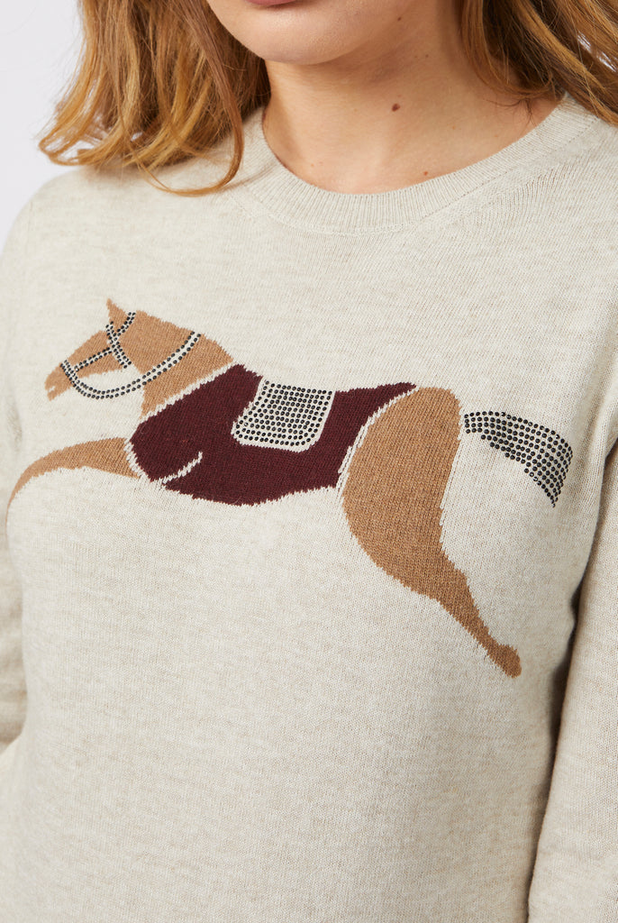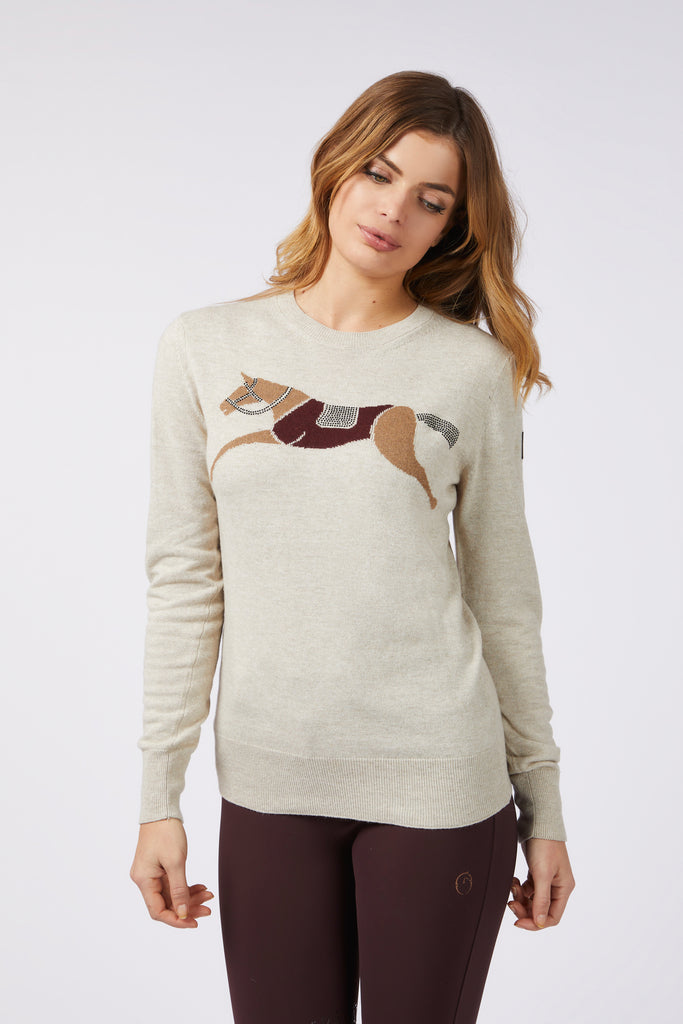 Another beauty from the Fall Vestrum Collection, the Saitama is a women’s crew-neck sweater made from a virgin wool and cashmere blend. The sweater is embellished with an inlay pattern depicting a horse and rhinestone appliqué details. A Vestrum patch is sewn on the left sleeve.